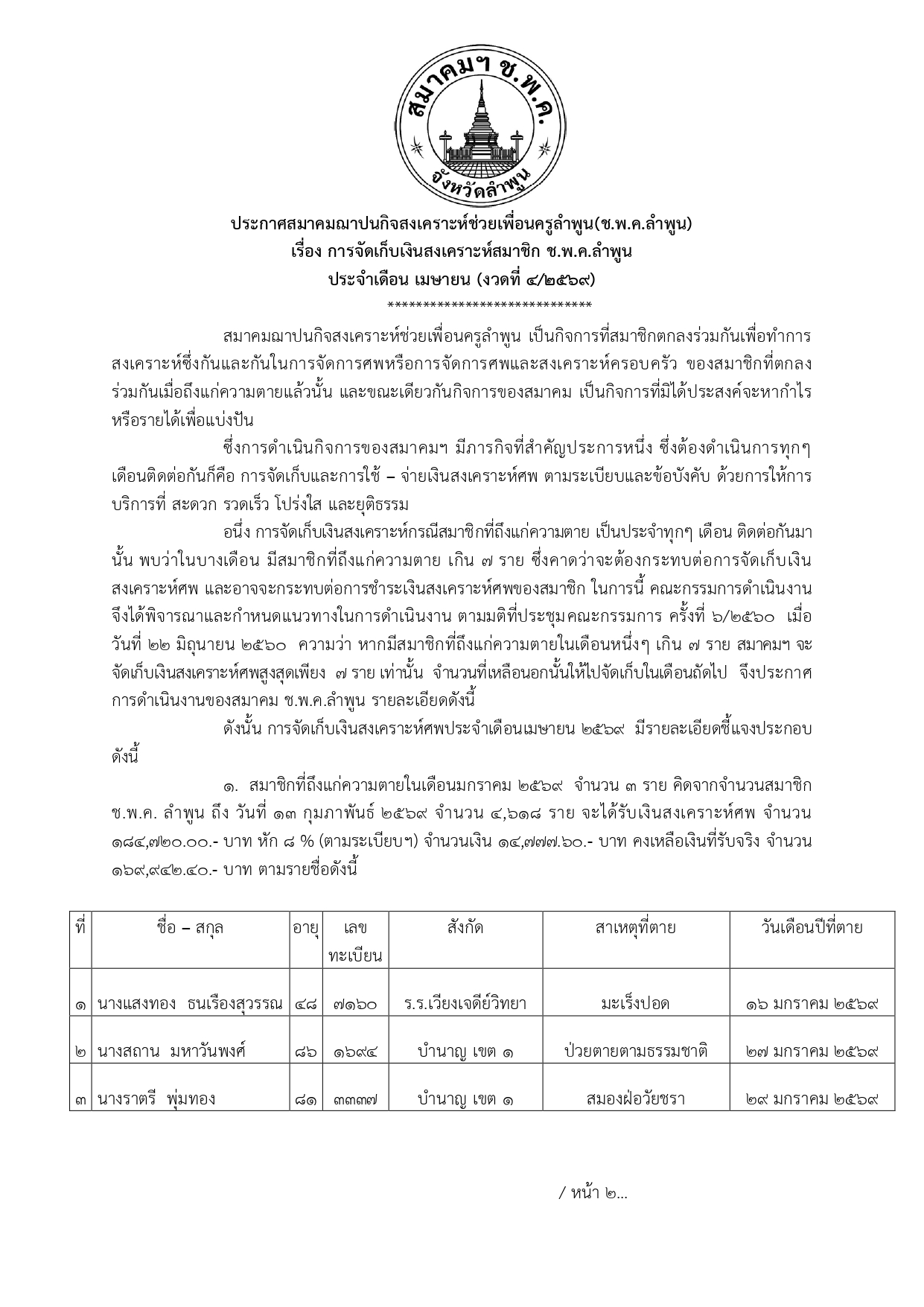 ประกาศเก็บเงิน เดือน เมษายน พ.ศ.2568