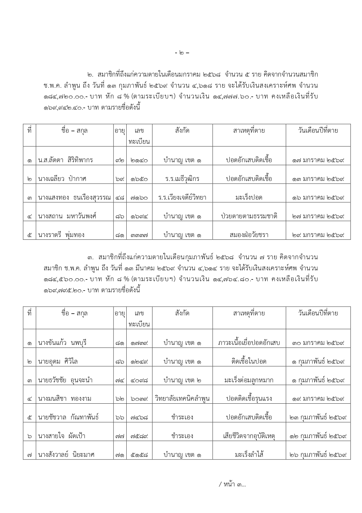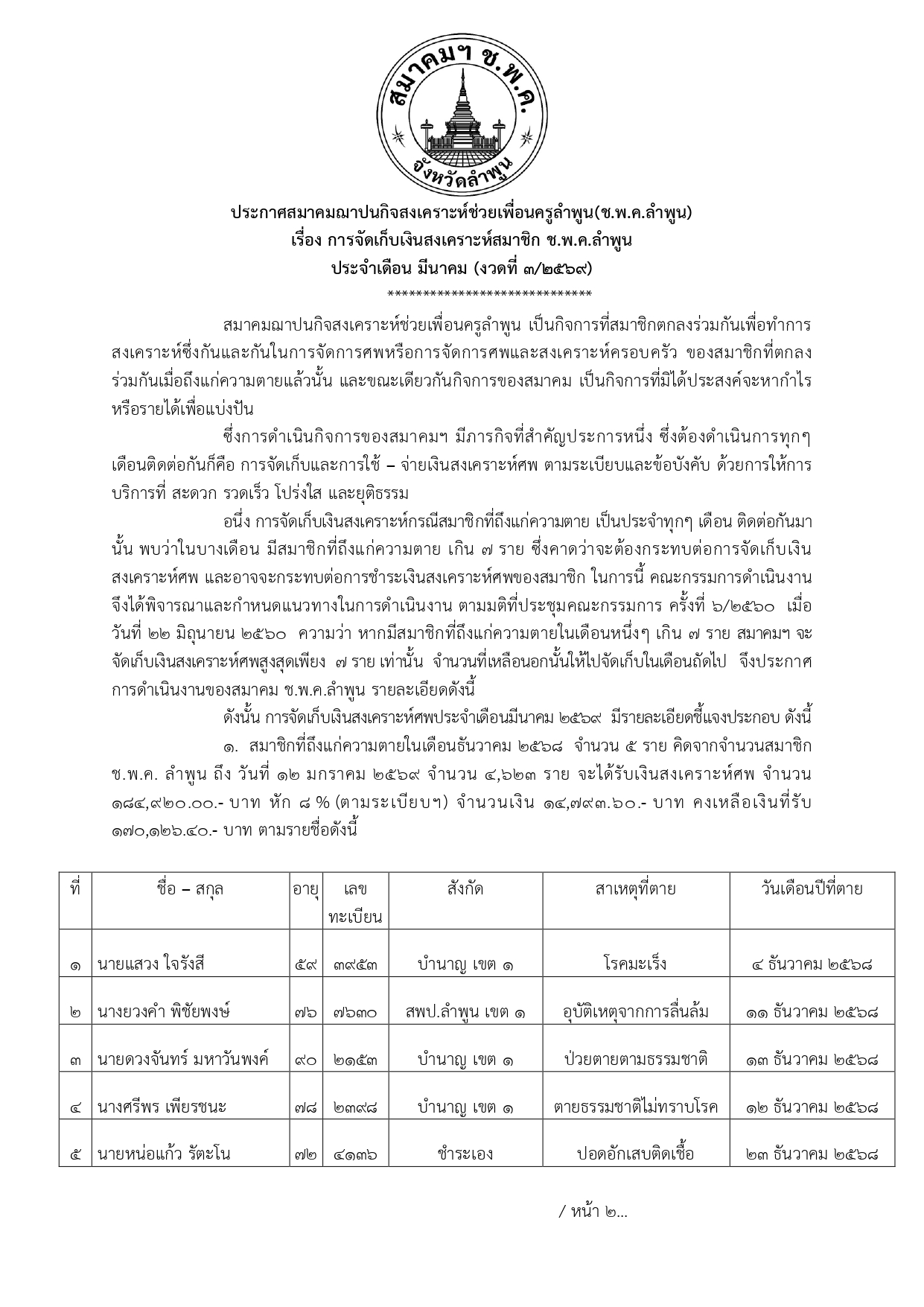 ประกาศเก็บเงิน เดือน กุมภาพันธ์ พ.ศ.2569
